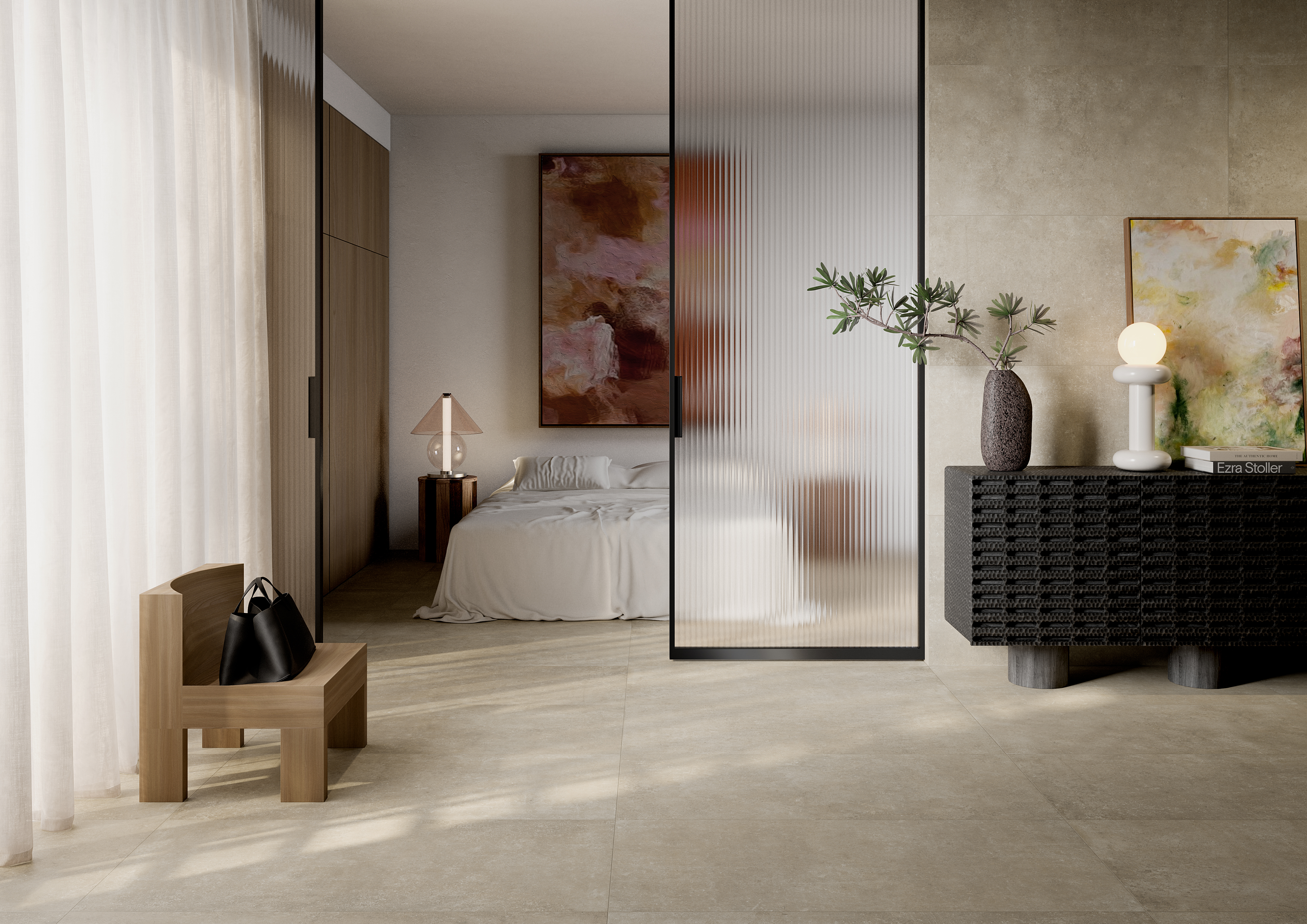 Cosmo, with its concrete-inspired look, serves as the perfect canvas for authentic industrial design. Its natural finish adds a touch of refined elegance, enhancing its urban aesthetic. These elements come together to create a sophisticated yet grounded atmosphere, where modernity and nature coexist in perfect harmony.